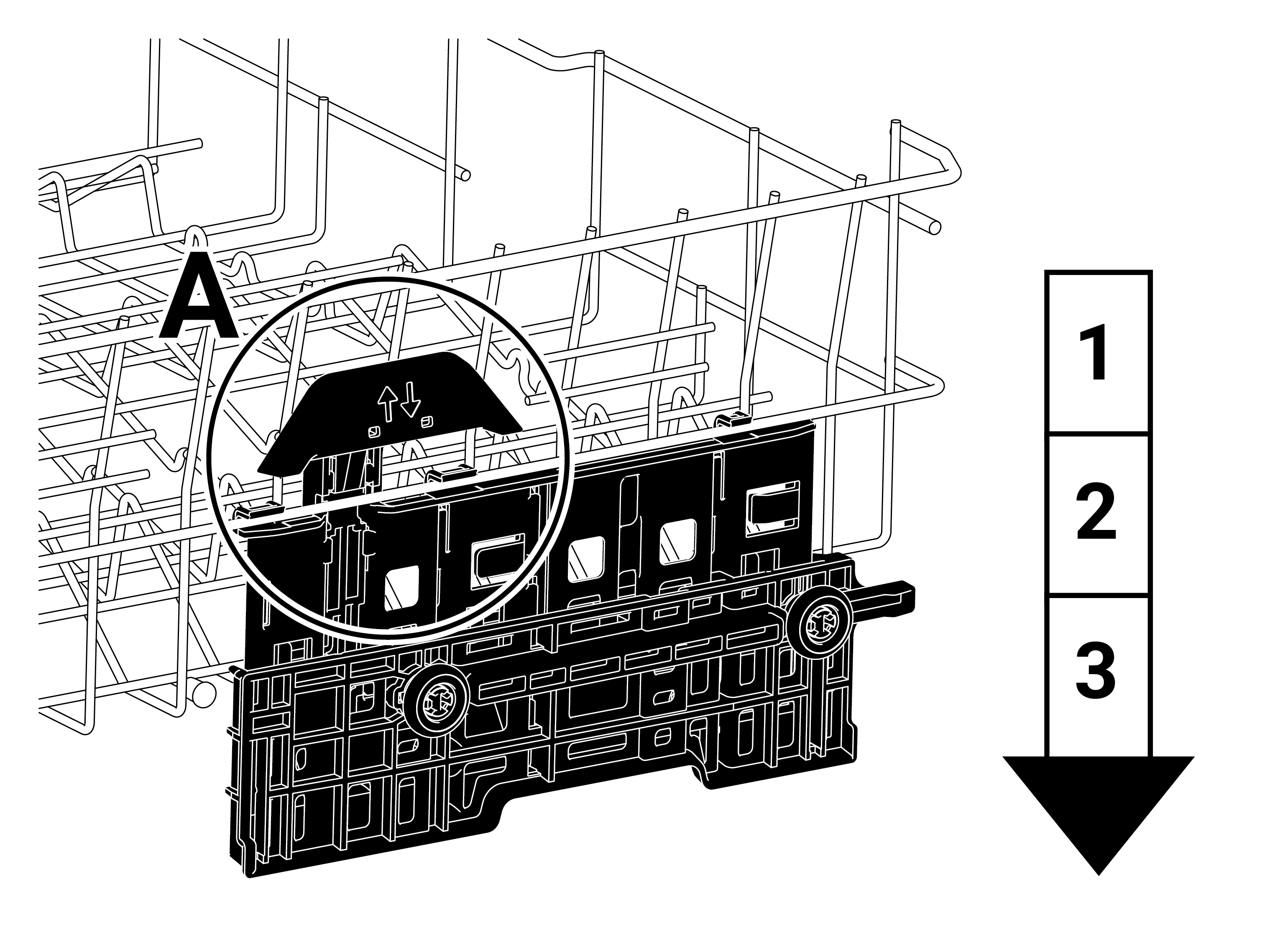 1. Üst sepet tellerini iki elinizle tutup mekanizmadaki tutamağı şekilde gösterildiği gibi (A) yukarı yönde kaldırın.