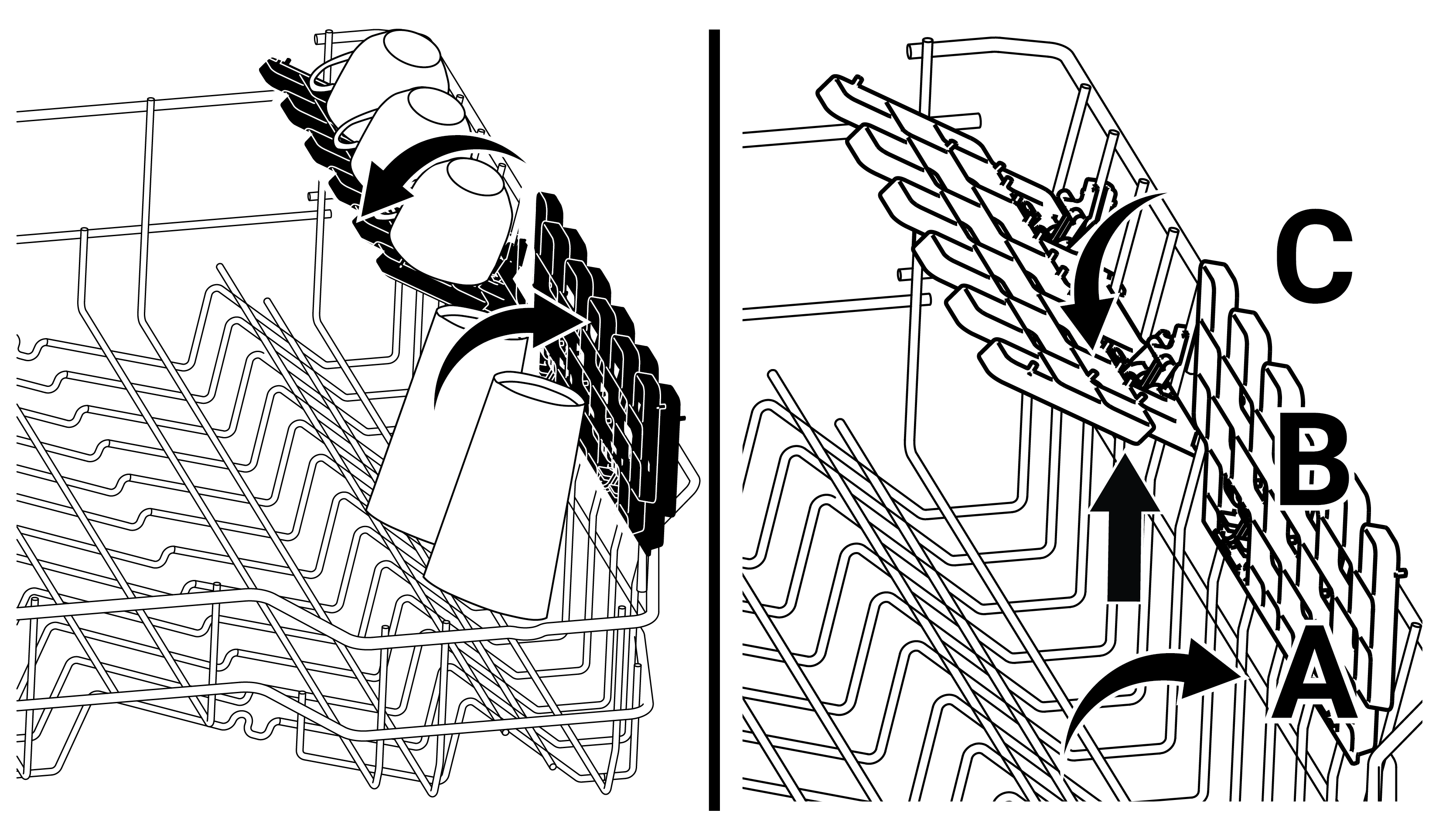 Makinenin üst sepetinde bulunan yükseklik ayarlı rafların; alt ve üst tarafını, bardak, fincan vb. bulaşıkların yüksekliğine göre aşağı veya yukarı konuma alarak dilediğiniz gibi kullanabilirsiniz (A, B, C).