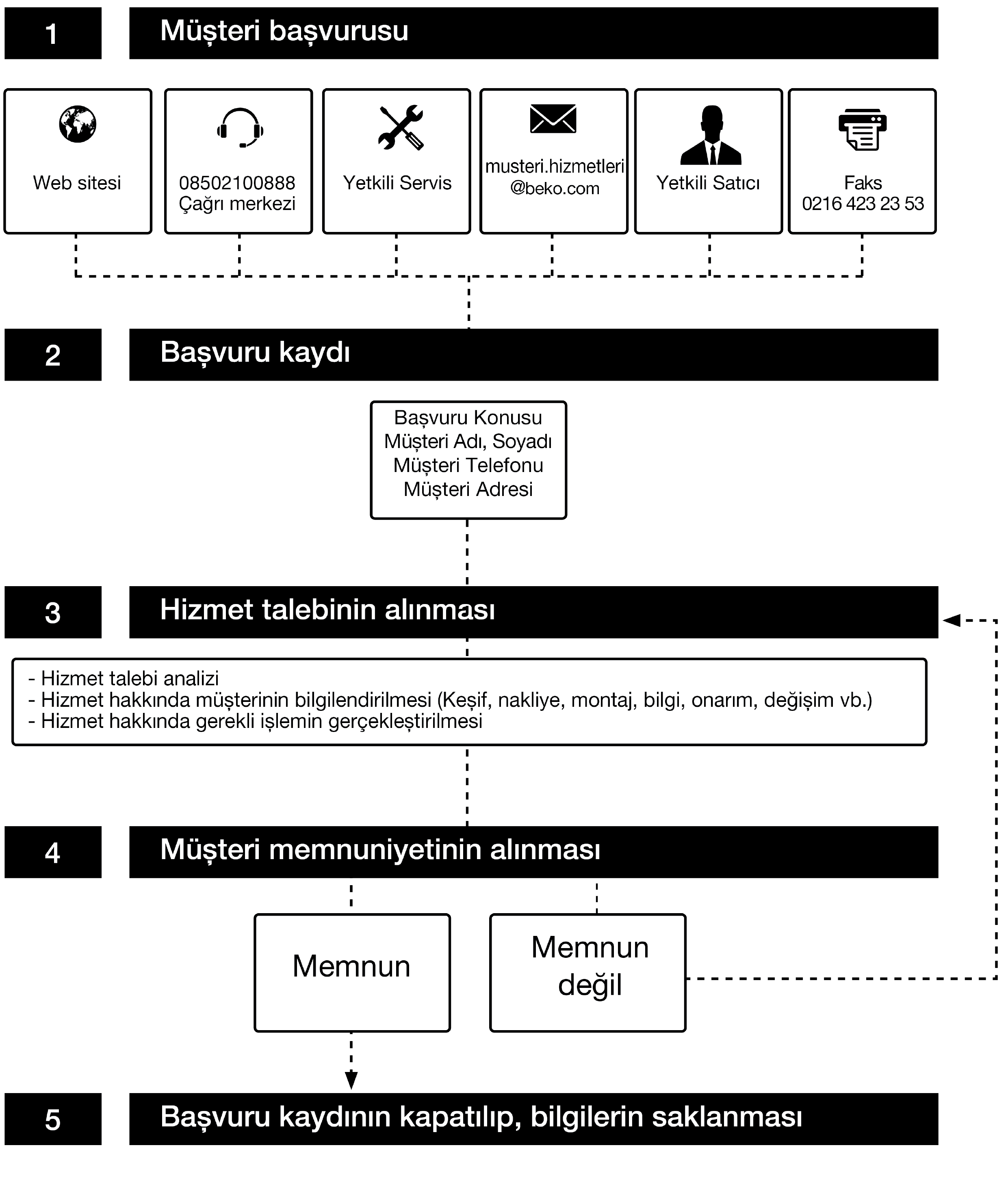 Wir informieren unsere Kunden darüber, dass ihre Anfragen und Vorschläge innerhalb von 24 Stunden bei uns eingehen, unabhängig vom Kundenprofil. Unser Kundendienst-Prozess: Wünsche und Anregungen unserer Kunden; - werden in einem einzigen, auswertbaren, transparenten und sicheren Informationspool gesammelt. - werden objektiv, fair und vertraulich im Rahmen der gesetzlichen Bestimmungen behandelt und ausgewertet. - nutzen wir diese Rückmeldungen, um unsere Prozesse weiter zu perfektionieren. Als Beko betrachten wir die Aufrechterhaltung eines perfekten Kundenerlebnisses als unser Hauptprinzip und verfolgen einen kundenorientierten Ansatz. Wir sorgen für die Entwicklung einer Struktur, die sich gegenseitig kontrolliert, indem wir alle unsere Prozesse in das Managementsystem integrieren. Auch die Managementziele werden über dieses System gesteuert. | |